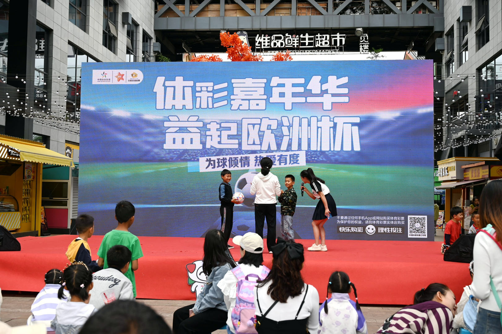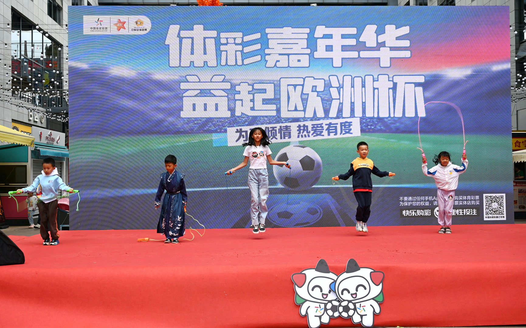 “今年是中国体育彩票成立多少周年?” “中国体育彩票每年支持公益的资金由什么组成?” “今年欧洲杯的冠军奖杯叫什么?” …… 活动以火热的舞蹈开场,紧接着的益起“欧洲杯”互动问答燃爆了现场,为了得到体彩小礼物,现场的小朋友、大朋友们都踊跃作答。