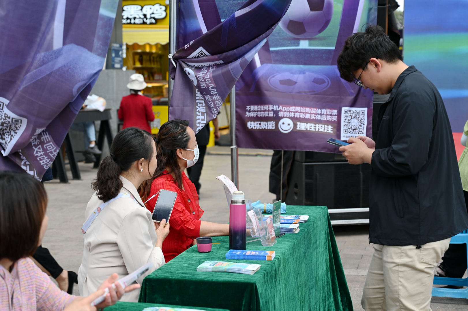 与此同时,活动现场的多重趣味性互动——扫码抽奖、扫码免费领彩票,也吸引着越来越多的围观人群驻足,一时间被围得水泄不通,都希望自己能被幸运大奖眷顾。